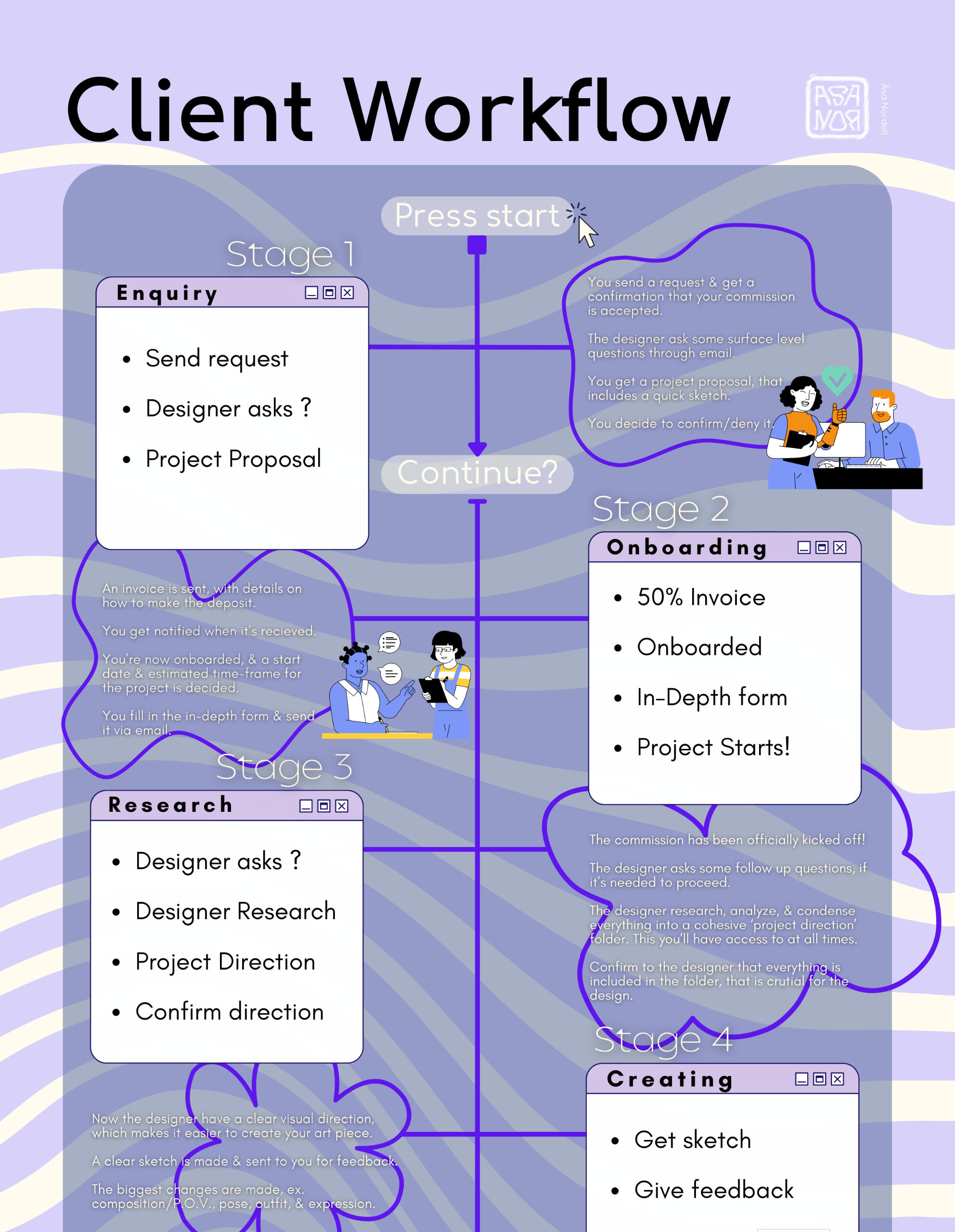 Here I've outlined the workflow for you as a client,